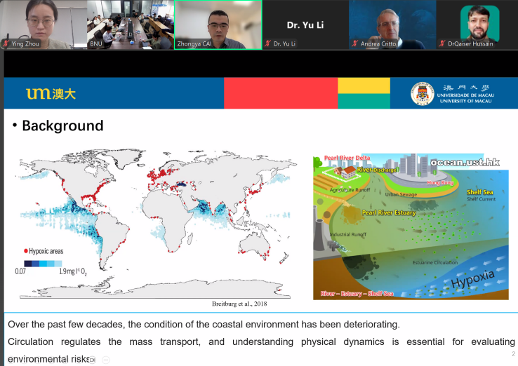 在专题报告环节,四位特邀专家分享了前沿研究成果。澳门大学Zhongya Cai助理教授介绍了厄尔尼诺-南方涛动现象对南海北部陆架环流的影响及其对大湾区海洋生态环境的潜在效应。意大利威尼斯卡福斯卡里大学Andrea Critto教授分析了土地覆盖变化与气候变化对意大利水质的综合影响。俄罗斯人民友谊大学Yury Dvornikov助理研究员聚焦西伯利亚西部永冻土区湖泊的甲烷排放机制,揭示了气候变暖背景下温室气体释放的新特征。巴基斯坦毕尔梅尔·阿里·沙阿旱区农业大学Qaiser Hussain副教授介绍了Pothwar高原土壤修复与保持的创新策略,为干旱区土地可持续利用提供了技术路径。报告期间,线上线下参会者围绕报告内容展开了热烈讨论,就技术创新、数据共享与合作模式等议题交换意见。